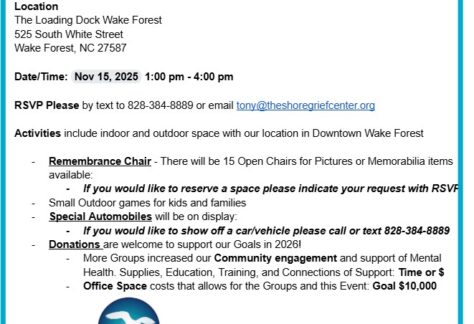 If you have experience the death of a child, parent, sibling, spouse, grandparent, or friend, The Shore Grief Center is here to help you make sense of the grieving process. At The Shore Grief Center, we provide peer-based grief support groups for ages six and up and assist with the highly-personal journey through grief. Our facilitators meet with suicide survivors, bereaved parents, and host a general support grief group in Wake Forest, North Raleigh, and Youngsville.